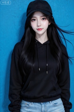 真实摄影,贴脸拍摄,戴着黑色鸭舌帽,穿着黑色连帽衫、浅蓝色牛仔裤,正面靠在高饱和度蓝色墙面前,整体风格酷帅、简约,(电影级面光:1.6),(光线追踪:1.5),(冷白皮漫感质感的光滑皮肤:1.7),(人物有最好的骨相:1.2),(网感脸:1.6),(网感妆:1.6)身材完美,莫兰迪配色,高颜值网红,INS风,幼态脸,19岁女生尖下巴,三庭五眼比例均衡,身材娇小,细腻陶瓷水嫩肌肤,偏冷白皮,随机的妆容,随机的饰品,随机的动作,侧光,发丝轻飘,凌乱,随机角度拍摄,总体有很多的不确定性,但又好看,