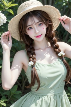 眉目如画,眼瞳澄澈明亮,带着陶醉又灵动的神采,直面镜头时眼神鲜活有互动感,笑意藏在眼底,表情娇俏可爱;眉形纤细自然,唇瓣是淡淡的粉,透着水润光泽,整体五官精致却不刻意,满是少女的鲜活气息。棕色长发编成蓬松垂坠的麻花辫,发丝带着自然的纹理与蓬松感,垂落在肩颈与后背,发间点缀着几朵细碎白色小花,与周遭绣球花相映成趣,边缘随动态轻微失焦,更添真人感。