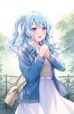 1girl,solo,long hair,blush,smile,bangs,skirt,shirt,hair ornament,long sleeves,white background,dress,ribbon,jewelry,blue hair,purple eyes,jacket,hair ribbon,:d,earrings,bag,one side up,white skirt,own hands together,blue jacket,shoulder bag,light blue hair,denim jacket,matsubara kanon,nature,in spring,