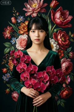 The image depicts a person standing in front of a richly detailed floral background. The individual is dressed in a dark green velvet dress with a V-neckline. They are holding a bouquet of deep red orchids, which are prominently displayed in the foreground. The flowers are large and vibrant, creating a striking contrast against the dark background. The floral arrangement behind the person is composed of various types of flowers, including roses, tulips, and other blooms, all rendered in a highly detailed and realistic style. The overall composition of the image is elegant and artistic, with a focus on the rich textures and colors of both the person's attire and the floral background.