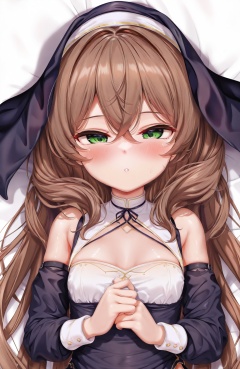masterpiece,absurdres,best quality,((petite)),loli,high quality,chromatic_aberration,shiny_skin,//,1girl, solo, long_hair, green_eyes, brown_hair, looking_at_viewer, blush, lisa_\(genshin_impact\), lying, on_back, dakimakura_\(medium\), breasts, bed_sheet, parted_lips, hair_between_eyes, habit, nun, bare_shoulders, detached_sleeves, upper_body, crossed_bangs, veil, criss-cross_halter, neck_ribbon, small_breasts//,<lora:kokuto_(kurousagi1210)——【CKXL】hans:0.88>,