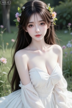 背景充满花草树木草,超清晰画质,妆造精致,饰品精巧,棕色长发上编织许多鲜花和叶子搭配,头发和鲜花花巧妙结合,身着白色飘逸长裙蓬松极简风格,细节完美,五官精致,突出头发凌乱美,面部清晰,清冷调。日常快照风格,非精心构图,非专业打光。(电影级面光:1.6),(光线追踪:1.5),(冷白皮漫感质感的光滑皮肤:1.7),(人物有最好的骨相:1.2),(网感脸:1.6),(网感妆:1.6)身材完美,莫兰迪配色,高颜值网红,INS风,幼态脸,19岁女生尖下巴,三庭五眼比例均衡,细腻陶瓷水嫩肌肤,偏冷白皮,随机的妆容,随机的饰品,随机的动作,侧光,发丝轻飘,凌乱,随机角度拍摄,总体有很多的不确定性,但又好看,