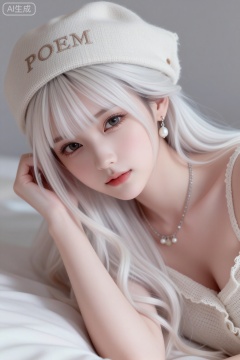 热搜预定!亚麻白金色长卷发少女,冷白皮雪瓷肌通透到发光,无辜漫画眼楚楚动人。戴着绣有香槟金丝线的POEM堆堆帽,眼神纯欲交织带着一丝迷离。双颊泛起浅浅粉晕,姿态慵懒像一只打盹的布偶猫。珍珠耳环与金属项链叠戴,搭配小众设计感服饰,细节精致。整体散发着不食人间烟火的仙气,柔焦滤镜下,肌肤如被月光吻过,柔雾质感与光泽并存,完美诠释“人间雪花酥”。女生表情自然松弛慵懒,眼神自然不失真(可看镜头或不看镜头),整体神态灵动又不失随性,尽显慵懒悠闲状态;整体为唯美的氛围感情绪片,无清晰主体,纯欲风,S型身材,B cup