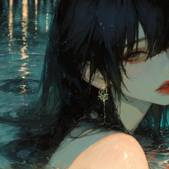 <lora:Tourun ThickPaint Style:0.8>,absurdres,realistic,rim light,wallpaper,best quality,1girl,solo,black hair,looking at viewer,earrings,jewelry,parted lips,bangs,long hair,water,portrait,red lips,blurry,water drop,rain,hair between eyes,bare shoulders,blurry background,lips,eyelashes,