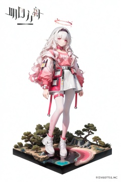 BJLH,official art,game art,diorama,white background,Arknights style,1girl,solo,white hair,pink gradient hair,curly hair,long hair,light red eyes,light red halo,pink and white jacket,light pink shirt,white short skirt,white_pantyhose,pink watch,pink collar,pink leg ring,full body,black headband,
