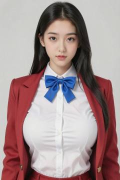 <lora:20260225_TinZITLBSWSliderLora_1_000000030:1.5>, This is a photograph of a young woman with fair skin and long straight black hair, large breasts. She was wearing a thick white button-down shirt with a blue bow tie, and a red suit jacket over it.