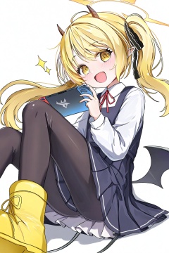 1girl, solo, ibuki (blue archive), :d, black horns, blonde hair, simple background, black ribbon, highres, light blush, pointy ears, ribbon, horns, absurdres, skirt, sleeveless, demon horns, open mouth, hair ribbon, dress, white background, yellow halo, boots, pinafore dress, sleeveless dress, yellow eyes, tail, pantyhose, yellow boots, nintendo switch, pleated skirt, black tail, commentary, halo, black pantyhose, smile, demon tail, looking at viewer