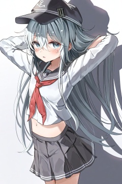 1girl, solo, hibiki (kancolle), anchor symbol, arms behind head, hands in own hair, long hair, simple background, flat cap, black skirt, hat, red neckerchief, neckerchief, white background, school uniform, hair between eyes, hair lift, cowboy shot, shirt, absurdres, serafuku, midriff, crop top, open mouth, very long hair, highres, skirt, black sailor collar, commentary request, hand in own hair, long sleeves, black hat, pleated skirt, white shirt, sailor collar, blue eyes, grey hair, looking at viewer, blue hair, navel