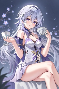 yao guang (honkai: star rail), 1girl, bare shoulders, blue nails, breasts, crossed legs, cup, dress, feet out of frame, fingernails, hair between eyes, hair intakes, hand up, holding, holding cup, looking at viewer, medium breasts, nail polish, parted lips, purple eyes, sitting, smile, solo, thighs, white dress, absurdres, commentary request, highres, wide shot
