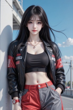 真实摄影,穿着黑红拼色皮夹克(带有文字印花)、黑色短款内搭、红灰拼色阔腿裤,佩戴项链、红色手表,倚靠在白色建筑结构旁,背景是蓝天与桥梁,街头风,潮流,时尚,户外场景,19岁江南美女子,东方美女,高颜值纯欲少女,idol气质,脸型精致,精致脸蛋,鼻梁高挺,尖下巴,三庭五眼比例均衡,身材娇小,完美高挑身材,冷白皮,细腻陶瓷水嫩肌肤,皮肤白皙透亮,人物有最好的骨相,网感脸。