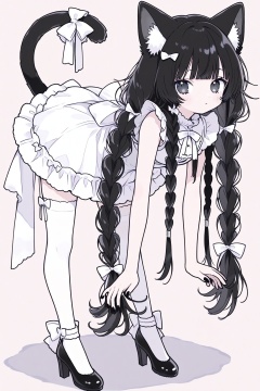 1girl, animal ear fluff, animal ears, black hair, black nails, blunt bangs, bow, braid, cat ears, cat girl, cat tail, dress, frilled dress, frills, full body, hair bow, high heels, leaning forward, long hair, looking at viewer, simple background, sleeveless, sleeveless dress, solo, standing, tail bow, tail ornament, thighhighs, twin braids, white background, white bow, white dress, white thighhighs