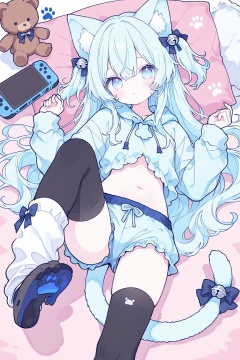 1girl, animal ear fluff, animal ears, bell, blue eyes, blue hair, blue hoodie, blue shorts, blue tail, bow, cat ears, cat girl, cat tail, controller, frilled shorts, frills, game controller, hair ornament, handheld game console, hood, hoodie, leg warmers, long hair, looking at viewer, lying, on stomach, paw print, pillow, shorts, soles, solo, stuffed animal, stuffed toy, tail, tail bell, tail ornament, teddy bear, thighhighs, two side up