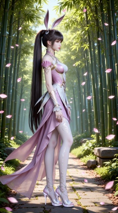 brown hair, long hair,ponytail, high ponytail, very long hair, brown eyes, hair_ornament, french braid, xiaowu metal collar, xiaowu pink dress, rabbit ears, fake ears,legs,long legs,white pantyhose, xiaowu white pantyhose, xiaowu white fingerless gloves, xiaowu crystal high heels, 1girl, from side,solo, petals, falling petals, full body,closed mouth,nature,bamboo