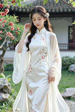<lora:20260302_TinZITSharpnessSliderLora_v1_000000090:2>, This photograph captures a young Asian woman standing in a serene garden setting, bathed in soft, natural light. She has long, wavy dark brown hair adorned with delicate floral hair accessories. Her complexion is fair, and her makeup is subtle yet elegant, featuring soft pink lipstick and light eye shadow. She is dressed in a traditional Chinese outfit, known as a qipao, which is a form-fitting dress with a high collar and long sleeves. The dress is predominantly white with delicate floral embroidery in shades of pink and beige, adding a touch of elegance and femininity.Her qipao is paired with a matching sheer, white overcoat that flows gracefully, accentuating the outfit's fluidity. The fabric appears to be a blend of silk and chiffon, giving it a soft, luxurious texture. She holds her right hand delicately near her face, while her left hand rests by her side. The background features a traditional Chinese garden with blooming red flowers and green foliage, and a classical building with a tiled roof, contributing to the cultural and historical context of the image. The overall mood is serene and graceful, capturing a moment of tranquility and beauty.