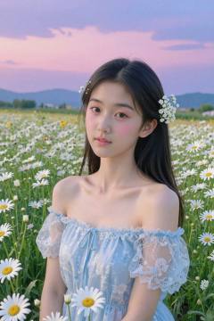 <lora:20260302_TinZITSharpnessSliderLora_v1_000000060:0>, This is a high-resolution photograph capturing a young Asian woman in a serene, sunlit field of blooming daisies. The woman, likely in her early twenties, has long, straight black hair adorned with delicate, white baby's breath flowers. Her skin is smooth and fair, with a natural, radiant complexion. She is dressed in a light, off-shoulder, light blue dress with sheer, lace-like sleeves and a subtle floral pattern, which complements the surrounding flowers. Her makeup is minimal but accentuates her eyes with a soft, pink blush and subtle eyeliner, giving her a fresh, natural look. The background features a vast expanse of daisies in various stages of bloom, with some flowers fully open and others still in bud, creating a lush, vibrant field. The sky is a beautiful gradient of soft pinks and purples, transitioning into a deeper blue as it reaches the horizon, suggesting either dawn or dusk. In the distance, rolling hills or mountains are faintly visible, adding depth to the scene. The overall mood is peaceful and ethereal, with the woman appearing almost like a serene spirit among the flowers.