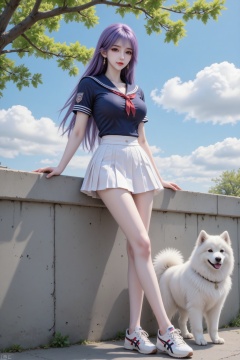 杰作级画质,顶级图像精度,超高清细节渲染,单人女性角色,(紫色亮丽的长发:1.4),(比例优越的纤细长腿:1.3),(肌肤白皙光滑的匀称美腿:1.4),(挺拔饱满的D 罩杯曲线:1.4),(精致立体的美颜五官:1.4),美颜全开,光滑油亮的皮肤,水嫩的肌肤,,傲人身材,C-cup,一个女孩,林紫玥单人,紫色长发,一位25岁左右的美女,身高170cm,黄金比例苗条,身材,穿着短袖海军衫、白色百褶短裙,大长腿,鬼冢虎鞋。人物动作:身体靠在水泥墙,一只手搭墙、走路的动作,,姿态随性又显穿搭比例背景是蓝天、绿叶树枝、白云,春日氛围,温馨。身旁有白色萨摩耶犬,背景是蓝天、一点绿叶树枝、白云,春日氛围,惬意。