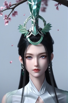 (score_9),collarbone,(glamor:1.1),narrow waist,<lora:陆嫁嫁pony-v2:0.83>,long hair,black hair,jade headdress,crystal earrings,headdress,BREAKlooking at viewer,front view,simple background,white background,twig,branch,falling petals,masterpiece,best quality,absurdres,highres,hd,letterboxed,<lora:a修手:0.8>,