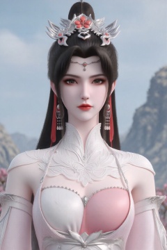 1girl,earrings,jewelry,solo,dress,hair ornament,upper body,mountain,flower,long hair,brown hair,white dress,ponytail,pink dress,branch,sky,looking at viewer,
