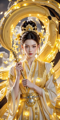Create a picture of Shiranui dance in Chinese grotesque style. The elegant and sacred Shiranui dancer wears gorgeous and luxurious costumes of light gold. Her compassion is evil, and her fair and tender skin shows an elegant texture. She looked shyly at the camera with squinting eyes and hooked her hand to the camera, creating a strong sense of temptation. She is holding a banana-shaped magic weapon, and is surrounded by banana-shaped sword energy. The sword energy is sharp, elegant, and agile. A huge golden banana is looming behind the character, connecting the sky and the earth. The golden banana sword energy surrounding the character disappears into the foreground, adding a layer of hazy beauty. Use thick brush strokes and low saturation, but keep the texture of the brush strokes clear to create the effect of heaven and earth. The expression is cold and holy, compassionate, aloof, cold and indifferent, giving people a sense of oppression. It adopts super wide-angle strong perspective, looking up to shoot, with bottom light hitting the face, strong contrast between light and dark, natural shadow transition, thick fog, beautiful glow, and the overall tone is close to the style of Nolan movies, with a black style. The interweaving of light and shadow is dreamy and hazy, epic and grand, with strong fantasy colors, full of a sense of fate and story, and showing dynamic tension. Using UE5 rendering, 8K ultra-clear, extreme details, master-level composition, movie-level texture, advanced artistic sense, and strong visual impact.