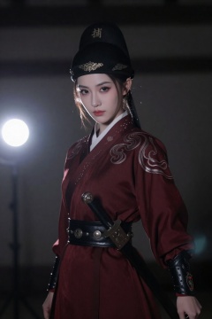一位俊美冷艳的唐代机甲女差役形象。她头戴微微上翘的黑色金边刺绣图案幞头,上面印有錞金小字“捕”,露出那圆润饱满、肤色白皙的额头。弯弯的柳叶眉下,明亮有神的双眸中透着坚定与干练。小巧挺直的鼻梁,淡雅朱红的樱桃小嘴微微抿起。大眼,睫毛,眼线,粉唇,身着一袭酒红色的窄袖机甲胡服,领口与袖口处绣着精致的银丝云纹,黑色皮质腰带束于腰间,上面挂着差役令牌。小蛮腰上挎着一柄带红樱的捕头刀鞘,身材凹凸有致,她整体造型展现出职业的威严,画面色调沉稳且和谐,突出了人物的独特气质。身后有探照灯,闪光灯拍摄,逆光,发丝光,轮廓光,暗调摄影,动态模糊,强烈的视觉冲击力,倾斜构图,
