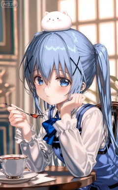 1girl, kafuu chino, tippy \(gochiusa\), blue eyes, rabbit house uniform, hair ornament, spoon, x hair ornament, angora rabbit, cup, looking at viewer, blush, long hair, teacup, rabbit, blurry, long sleeves, blue hair, holding, twintails, blue bow, blurry background, bow, animal, holding spoon, depth of field, white shirt, shirt, indoors, alternate hairstyle, vest, table