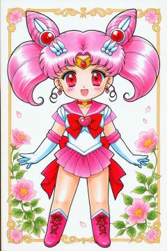 Juu Kuroinu Style,1girl,solo,sailor chibi moon,pink sailor collar,sailor senshi uniform,chibi usa,jewelry,heart,skirt,pink hair,sailor collar,white gloves,brooch,red eyes,hair bun,choker,gloves,heart choker,heart brooch,earrings,double bun,pleated skirt,smile,cone hair bun,hair ornament,bow,twintails,elbow gloves,magical girl,cowboy shot,open mouth,back bow,red bow,:d,miniskirt,standing,circlet,short hair,looking at viewer,hairpin,traditional media,float background,flower,full body,boots,chibi,<lora:black dog chibi_illustriousXL:1>,