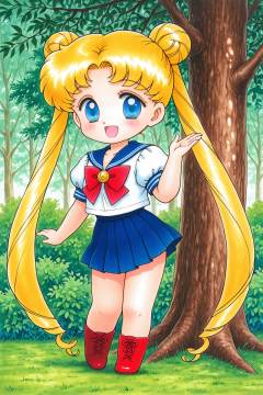 Juu Kuroinu Style,tsukino usagi,long hair,1girl,solo,skirt,twintails,blonde hair,pleated skirt,blue eyes,school uniform,blue skirt,blue sailor collar,open mouth,short sleeves,very long hair,smile,red bow,looking at viewer,serafuku,puffy sleeves,puffy short sleeves,:d,traditional media,tree,no hairornament,hand up,full body,boots,chibi,<lora:black dog chibi_illustriousXL:1>,