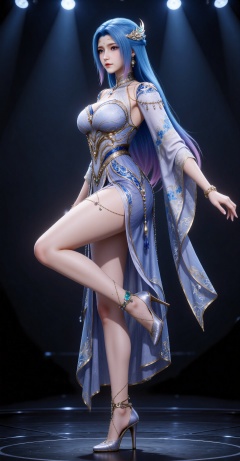 blue hair, long hair, blue eyes, multicolored hair, gradient hair, pink hair, large breasts, forehead mark, tangwutong blue and white dress, cleavage cutout, detached sleeves, necklace, hair_ornament, anklet, bracelet, high_heels, 1girl, solo, standing on one leg, full body, jewelry, standing, earrings, from side, leg up, legs, profile, stage lights, stage, bare legs