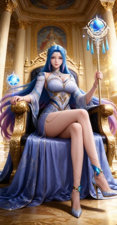 blue hair, long hair, blue eyes, multicolored hair, gradient hair, pink hair, large breasts, forehead mark, tangwutong blue and white dress, cleavage cutout, detached sleeves, necklace, hair_ornament, anklet, bracelet, high_heels, holding staff, 1girl, sitting, solo, throne, full body, crossed legs, looking at viewer, jewelry
