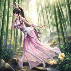 masterpiece,high quality,tall,game cg,highres,(soft light:1.2),(white_skin:0.6),(shiny_skin:0.6),(realistic:1.1),lvjing,xiaowu,1girl,solo,long hair,dress,hair ornament,ponytail,brown eyes,brown hair,rabbit ears,animal ears,pink dress,metal collar,collar,bare shoulders,black hair,braid,looking_at_viewer,nature,bamboo,flower,full body,