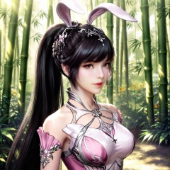 masterpiece,high quality,tall,game cg,highres,(soft light:1.2),(white_skin:0.6),(shiny_skin:0.6),(realistic:1.1),lvjing,xiaowu,1girl,solo,long hair,dress,hair ornament,ponytail,brown eyes,brown hair,rabbit ears,animal ears,pink dress,metal collar,collar,bare shoulders,black hair,braid,looking_at_viewer,nature,bamboo,flower,