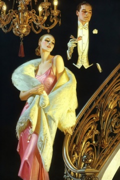 A sophisticated woman, dressed in a light pink slip dress and draped in a voluminous cream fur stole, stands on an ornate golden staircase, casting her gaze slightly upward and to the left. Behind her, a formally dressed man's head, white shirt, bow tie, and gloved hand are partially visible, with him looking forward. He holds a small, light-colored object between his fingers. A grand, multi-tiered golden chandelier with a dark red tassel hangs prominently in the upper left, complementing the elaborate golden railing of the staircase in the lower right. The scene is set against a deep, dark background.