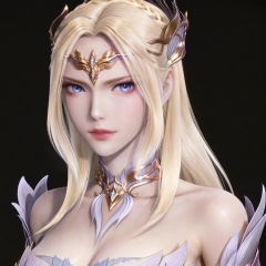 masterpiece,high quality,tall,game cg,highres,(soft light:1.2),(white_skin:0.6),(shiny_skin:0.6),(realistic:1.1),(looking_at_viewer:1.1),lvjing,simple background,,cleavage,large breasts,,blonde hair,long hair,french braid,hair_ornament,very long hair,crown,qianrenxue laurel crown,blue eyes,qianrenxue white and purple dress,qianrenxue armored dress,upper body,black_background,