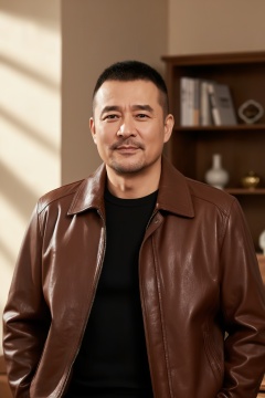 A middle-aged man with a sharp cut, a faint dark stubble on his lips and chin, and a calm and gentle expression. He was wearing a finely textured brown glossy leather jacket with a simple black top underneath. The zipper of the jacket was slightly opened, revealing the edges of the lining. The background is a warm indoor home scene, with a wooden bookshelf on one side, on which books and decorative ornaments are arranged in a staggered manner. Soft warm light shines through the wall with alternating light and shadow, creating a relaxed and comfortable atmosphere for the entire picture.