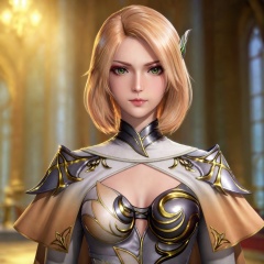 blonde hair, medium hair, green eyes, hair_ornament, shoulder armor, pauldrons, cleavage cutout, cape, hair_ornament, makeup, 1girl, solo, looking at viewer, blurry background, blurry, lips, closed mouth,upper body,