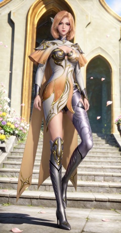 masterpiece,high quality,tall,game cg,highres,(soft light:1.2),(white_skin:0.6),(shiny_skin:0.6),(realistic:1.1),lvjing,,,hair_ornament,blonde hair,medium hair,shoulder armor,cleavage cutout,cape,makeup,asymmetrical clothes,huliena white and yellow dress,armored boots,high heel boots,single thighhigh,knee boots,thigh boots,1girl,solo,simple background,looking_at_viewer,green eyes,standing,large breasts,cleavage,full body,walking,stair,day,wind,flower,petals,
