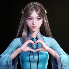 masterpiece,high quality,tall,game cg,highres,(white_skin:0.6),(shiny_skin:0.6),(realistic:1.1),looking_at_viewer,lvjing,,brown hair,long hair,blue eyes,very long hair,tiara,ningrongrong blue dress,butterfly hair ornament,braid,long_sleeves,wide_sleeves,1girl,solo,upper body,black_background,simple background,heart hand,from side,