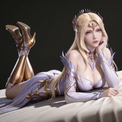 masterpiece,high quality,tall,game cg,highres,(white_skin:0.6),(shiny_skin:0.6),(realistic:1.1),looking_at_viewer,lvjing,black_background,simple background,dutch angle,dynamic_angle,,blonde hair,long hair,french braid,hair_ornament,very long hair,crown,qianrenxue laurel crown,blue eyes,qianrenxue white and purple dress,qianrenxue armored dress,detached_sleeves,long_sleeves,armored boots,knee boots,gold footwear,legs,long legs,bed,on_stomach,feet up,full body,large breasts,cleavage,