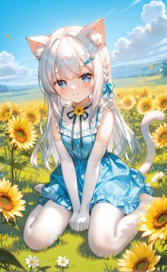 masterpiece,very aware,highres,absurdres,newest,best quality,petite,high quality,chromatic_aberration,cinematic_angle,dutch angle,child,petite,//,high quality,cat ears,1girl,animal ears,gloves,dress,blue eyes,sitting,blue dress,tail,cat tail,solo,white pantyhose,flower,pantyhose,white gloves,long hair,white hair,cat girl,outdoors,grass,blush,elbow gloves,animal ear fluff,smile,looking at viewer,wariza,no shoes,hair ornament,braid,sleeveless,hand between legs,ribbon,sleeveless dress,between legs,black ribbon,field,closed mouth,hairclip,side braid,sky,neck ribbon,full body,cloud,frilled dress,:3,pillarboxed,day,white flower,bare shoulders,bow,frills,sunflower,yellow flower,bangs,flower field,hair bow,+ +,artist:ciloranko,