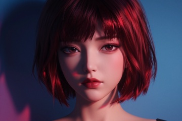 YY Anime style,CG,digital illustration in a stylized, semi-realistic art style, characterized by bold, dramatic lighting and shadowing. The subject is a young woman of East Asian descent, with a smooth, porcelain-like skin tone and a striking, symmetrical face. She has a short, sleek bob haircut with a deep, rich red hue, contrasting sharply with the cool blue tones in the background. Her eyes are almond-shaped, with a piercing gaze, enhanced by dark eyeliner and subtle, arched eyebrows. Her lips are full and slightly parted, with a natural, glossy sheen.  The background is a gradient of cool blues and dark purples, with a subtle, abstract geometric shape in the left side, adding depth and contrast to the scene. The lighting creates a dramatic interplay of light and shadow, with the red light source casting a striking diagonal across her face, highlighting the contours and creating a dramatic, almost cinematic effect. The shadows are deep and well-defined, emphasizing the shape of her face and the texture of her hair. The overall mood is intense and somewhat mysterious, with the color palette evoking a sense of cool, modern sophistication. The illustration showcases a blend of realism and stylized elements,