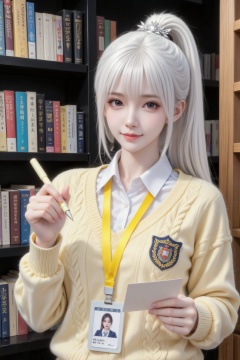 微距过肩拍摄,一位1 岁女大学生长相呆萌可爱的钝感女生,纯欲风,表情可爱,年轻娇小,冷白皮气质美女,皮肤白皙,偶像气质,光滑,千金大小姐气质,留白长直,扎高马尾并搭配银色发饰,齐刘海修饰脸型。她身着米黄色绞花纹校园风针织V领毛衣(胸前有校徽)内搭白色翻领衬衫,胸前挂着黄色织带有带照片和管理员等文字的工作牌,右手中握着浅色水笔指向镜头,左手拿着浅色卡片,妆容清新,用调皮的眼神看向镜头,表情柔和。背景为书吧环境,身后是摆满各类书籍的黑色书架,书籍封面色彩多样,能看到不同题材、语种的装帧设计,右侧有木质书架框架,整体氛围文艺。整体为室内柔和漫射光,人物面部受光均匀,无明显硬阴影;头发、衣物的褶皱处有自然明暗过渡,背景书架区域光线稍暗,通过明暗对比突出前景人物,营造出温馨、柔和的室内视觉效果