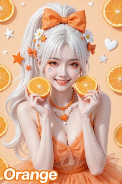 - 动作:双手各拿着一片切开的橙子,靠近脸颊,面带灿烂的笑容。