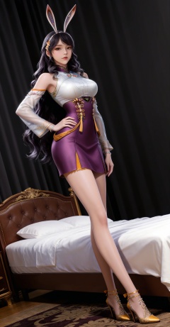 masterpiece,high quality,tall,game cg,highres,(white_skin:0.6),(shiny_skin:0.6),(realistic:1.1),looking_at_viewer,lvjing,black_background,simple background,,black hair,long hair,very long hair,wavy hair,brown eyes,large breasts,hair_ornament,hairband,fake animal ears,rabbit ears,jiangnannan white shirt,detached_sleeves,see-through_sleeves,long_sleeves,jiangnannan purple high waist skirt,bare shoulders,high_heels,jewelry,full body,legs,long legs,hand on hip,bed,dynamic_angle,dutch angle,standing,leg up,
