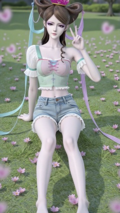 The image shows a person sitting on a grassy area, surrounded by scattered pink flowers. The person is wearing a light green sleeveless top with a small heart design on the chest and denim shorts. They are making a peace sign with their right hand and have their legs stretched out in front of them. The background consists of a lush green lawn with scattered flowers, and the lighting suggests it is a sunny day. The person is positioned centrally in the frame, and the image has a soft focus effect, giving it a dreamy appearance.