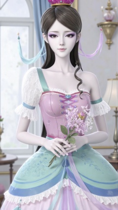 The image shows a young woman with long, wavy black hair, wearing a strapless pink dress adorned with floral embellishments. She is standing indoors, near a window with a white frame, and is holding a bouquet of pink and white flowers. The background includes a wall with a light-colored panel and a small shelf with a decorative item. The overall setting appears to be a well-lit, elegant room, possibly a living space or a studio.