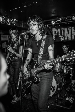A dynamic, high-contrast, black and white candid photograph capturing a female-fronted punk or indie rock band performing live in an intimate club or DIY venue. The lead guitarist and vocalist, a young woman with a choppy bob haircut and bangs, is front and center, passionately singing into a microphone while strumming an electric guitar. She wears a dark t-shirt, dark jeans, and a guitar strap with a unique pattern. Her left arm shows tattoos. To her left, another female guitarist with a similar haircut is visible, focused on her instrument. In the background, a drummer with short hair is intensely playing the drums beneath a 'PUNK' banner. The scene is gritty and energetic, with a crowd of blurred figures visible.