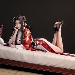 masterpiece,high quality,tall,game cg,highres,(white_skin:0.6),(shiny_skin:0.6),(realistic:1.1),looking_at_viewer,lvjing,black_background,simple background,,black hair, long hair, brown eyes, hair ring, braid, hair_ornament, qinyining, red kimono coat, qinyining white dress, qinyining hanfu, long_sleeves, wide_sleeves,,large breasts,cleavage,cleavage cutout,high_heels,jewelry,full body,legs,long legs,hand on hip,bed,dynamic_angle,dutch angle,on_stomach,feet up,