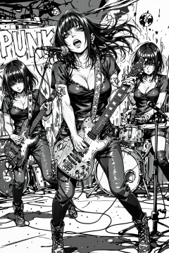 A dynamic, high-contrast, black and white image capturing a female-fronted punk or indie rock band performing live in an intimate club or DIY venue. The lead guitarist and vocalist, a young woman with a choppy bob haircut and bangs, is front and center, passionately singing into a microphone while strumming an electric guitar. She wears a dark t-shirt, dark jeans, and a guitar strap with a unique pattern. Her left arm shows tattoos. To her left, another female guitarist with a similar haircut is visible, focused on her instrument. In the background, a drummer with short hair is intensely playing the drums beneath a 'PUNK' banner. The scene is gritty and energetic, with a crowd of blurred figures visible.