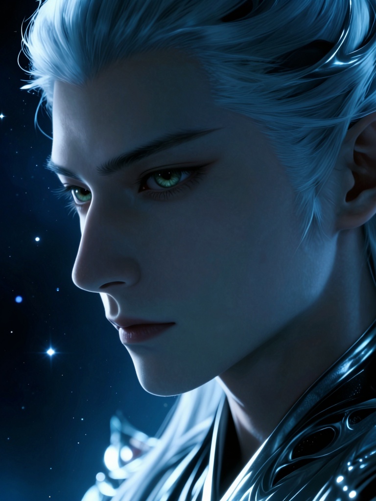 寒飞角色特写镜头中,银发男子侧脸凝视,浅绿眼眸锐利深邃;发丝与衣领泛冷光,肩部饰有流线型 - 2026-03-02 19:43:32