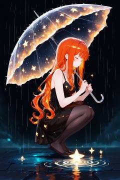 这是一幅充满奇思妙想和幻想的数字画作,描绘了一位年轻女子蹲坐在一片湿润且反光的表面。她拥有长长的、波浪状的橙红色头发,似乎像火焰般在她周围舞动。她身着一件饰有闪烁小星星的黑色无袖连衣裙,营造出一种浪漫而神秘的气氛。她闭着眼睛,仿佛在沉思或冥想,脸上流露出一种平静与安宁。她手中握着一把巨大的半透明雨伞,上面布满了无数发光的星星,为雨伞增添了一种神奇而梦幻的光彩。细雨滴在她周围轻轻落下,为整个场景增添了宁静与平和的氛围。背景深邃而幽暗,只有雨伞上的星星熠熠生辉,宛如夜空中的天体,为这幅画作赋予了一种浩瀚、宇宙般的感觉。地面上,星星的光芒被雨水反射,形成了迷人的涟漪,宛如水中倒映的星河。整个色调温暖,雨水则增添了一抹清凉的蓝色,使整个场景既舒适又略带清凉